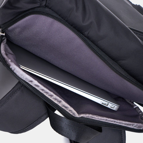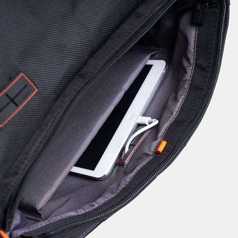 A backpack with panache, the Joint bag combines sleek, suave design with comfort and function, to keep you in control wherever your adventures may take you. The trendy flap features a magnetic buckle closure while style details include orange accents and gun metal hardware, as well as reflective elements that ensure you are seen in the dark. We’ve thought of everything, including a dedicated battery and device area, as well as a USB patch so you can keep your gadgets charged on the go. Comfort is key, even when carrying heavy loads, so there is a padded back panel, padded and adjustable shoulder strap and reinforced base material. The front pocket has soft lining for phone or glasses, while the back pocket has RFID protection making it perfect for your passport or contactless cards. Finally, you can use the smart sleeve to hook over your suitcase handle when travelling.